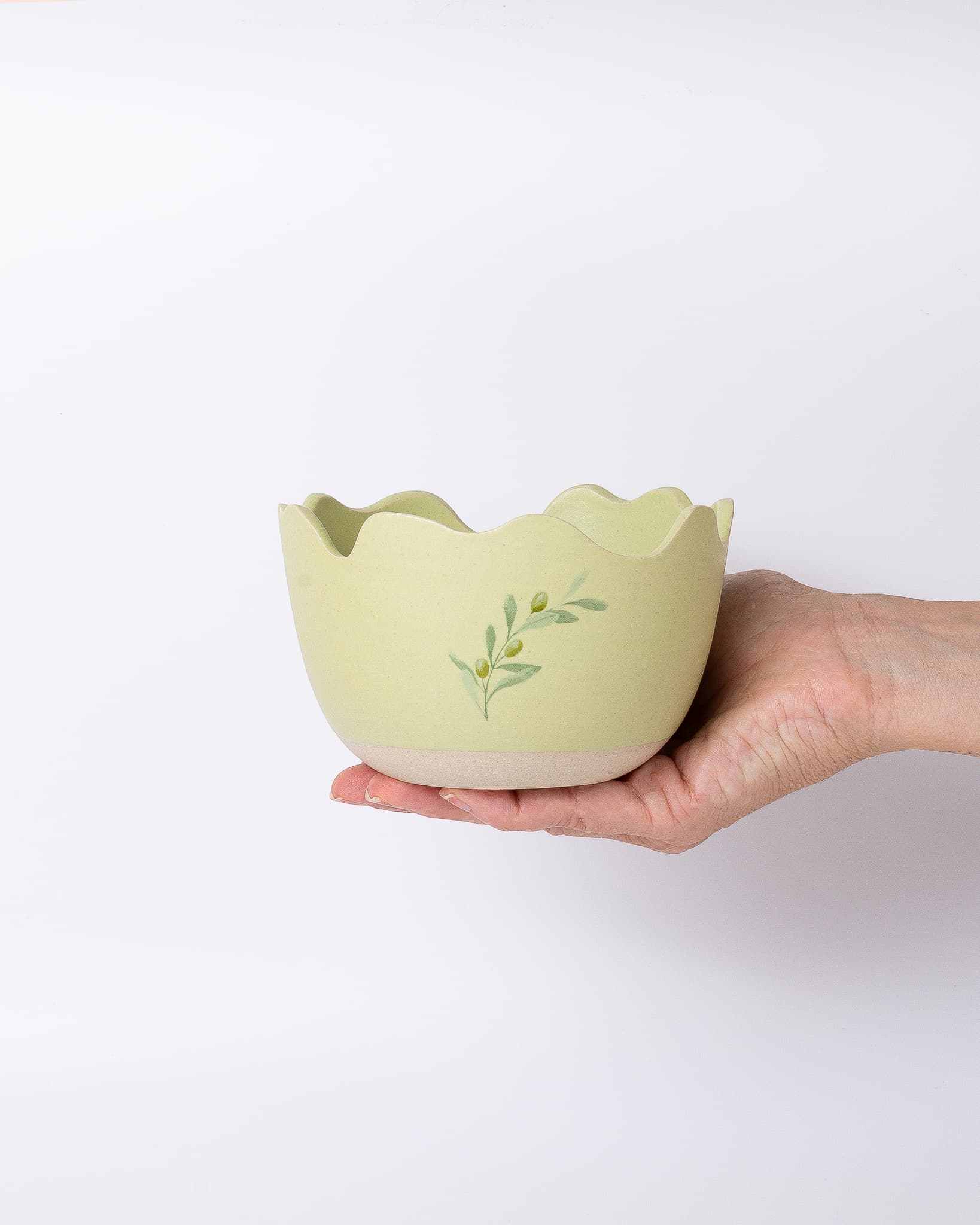 Entre Oliveiras, floresce a Páscoa. O Bowl Oliveira foi desenvolvido para a Páscoa desse ano de 2025 como uma casca de ovo recém-rompida, trazendo bordas onduladas a delicadas. Na superfície em tom verde primavera, um ramo de Oliveira aplicado em decalque reforça o símbolo da paz e do recomeço — essência da nossa Páscoa.