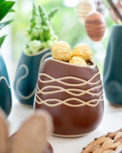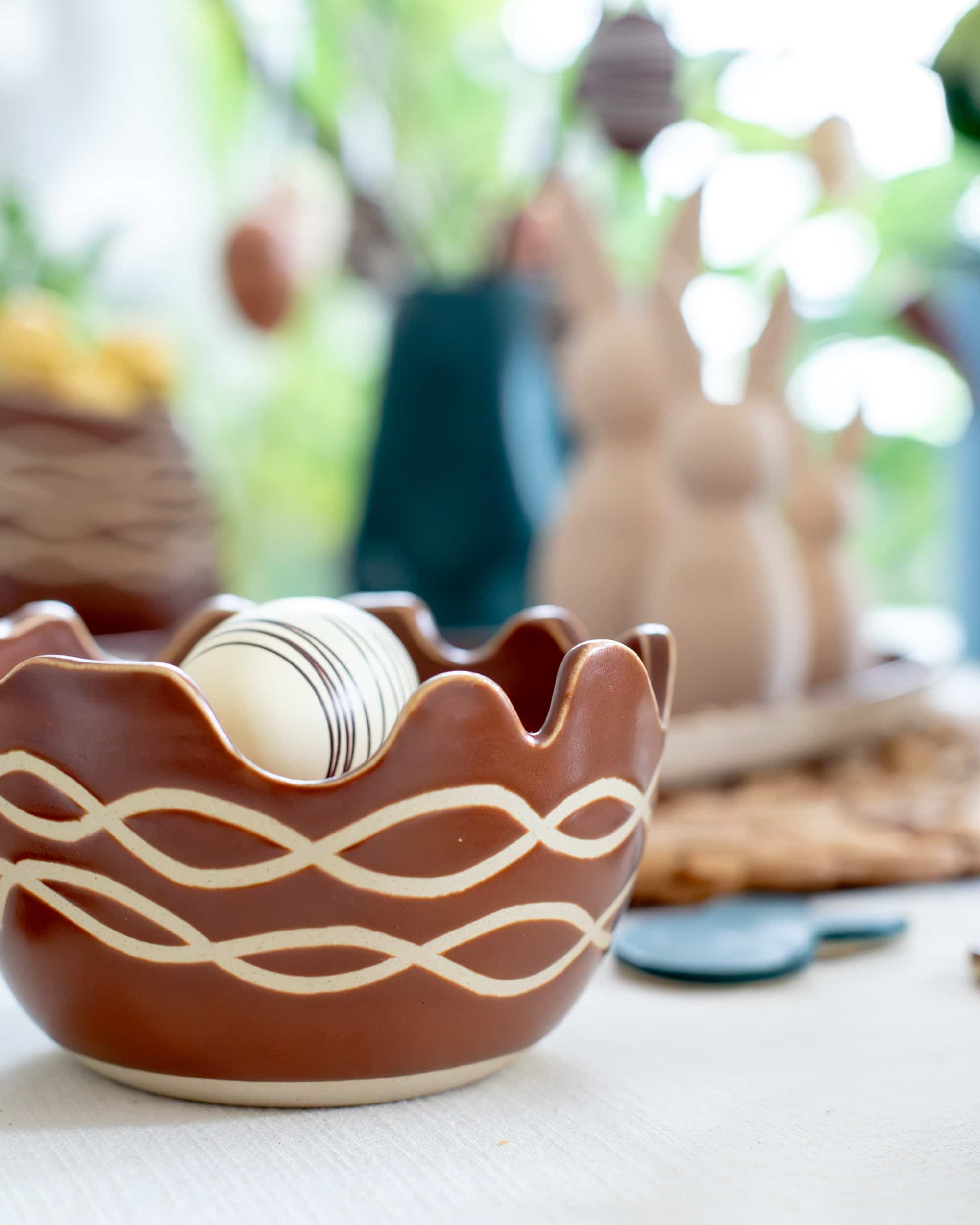 O Bowl traço natural foi desenvolvido para a Páscoa desse ano de 2026 como uma casca de ovo recém-rompida, trazendo bordas onduladas a delicadas. Em 2 cores (chocolate e verde mata) e com desenhos orgânicos que tornam cada peça única.