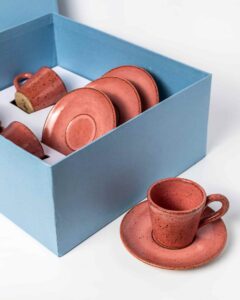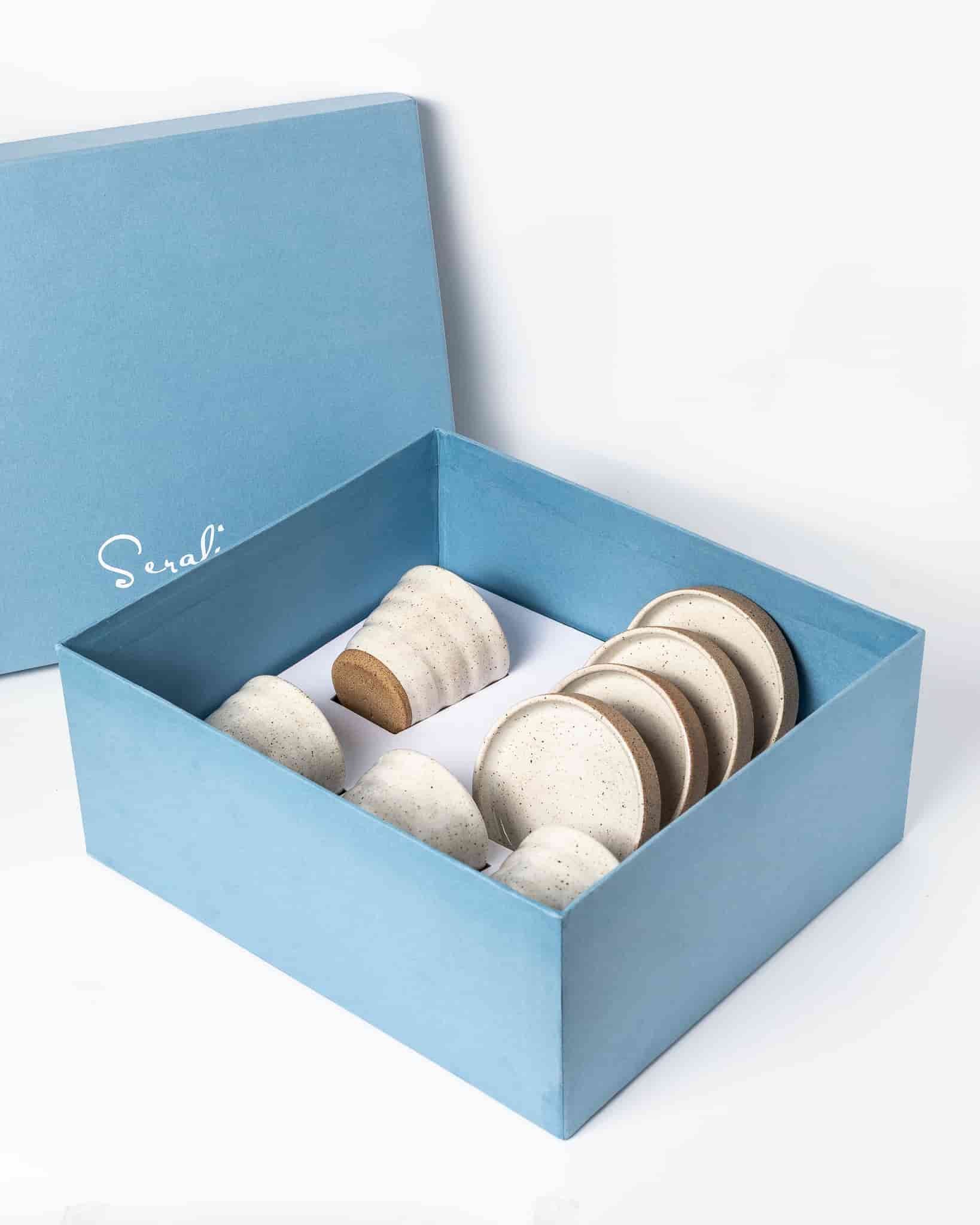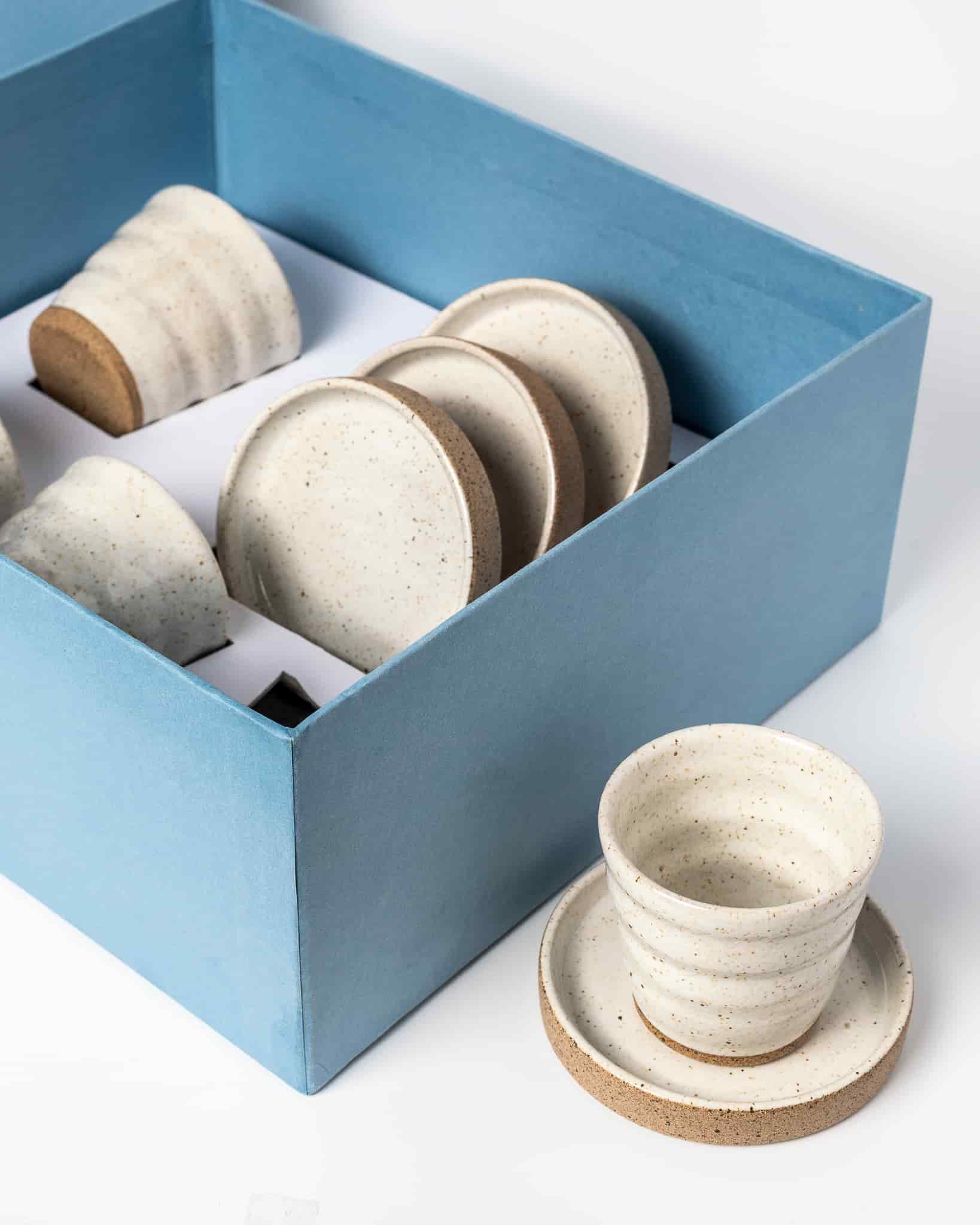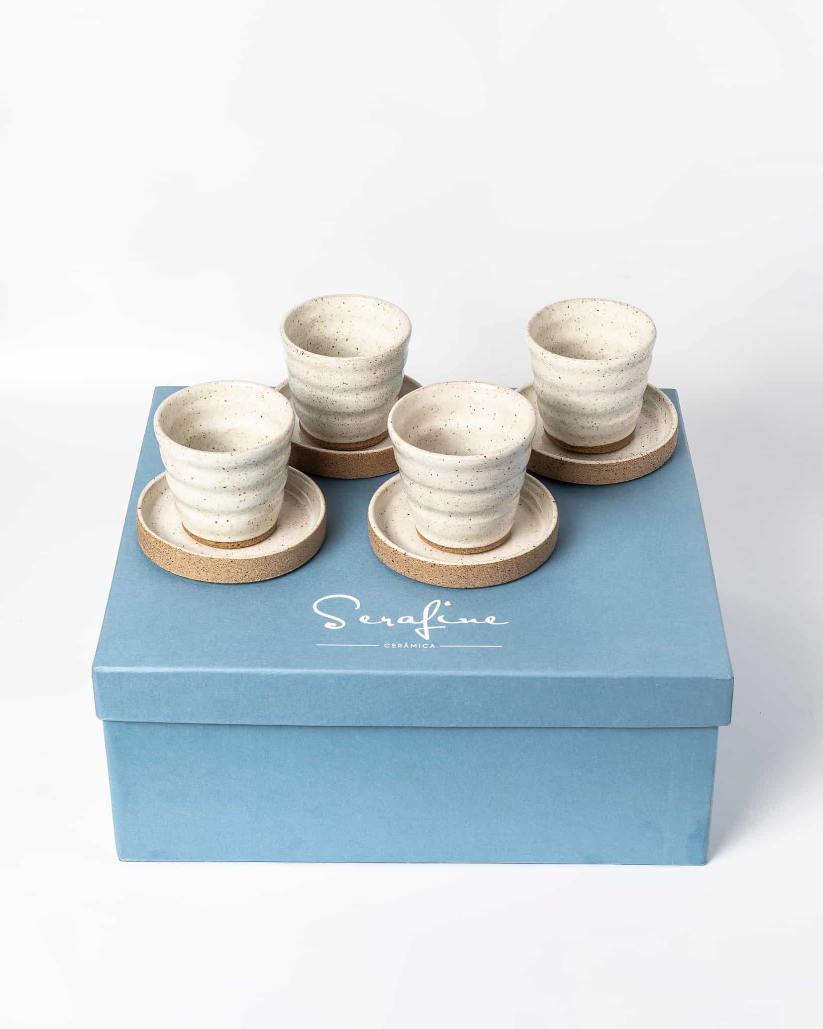 Jogo de 4 copos para café Loulé com detalhe ondulado e pires borda reta. Ideal para bebidas quentes ou frias. Nessa linha “Special Gift”, as peças acompanham a caixa de presente personalizada.