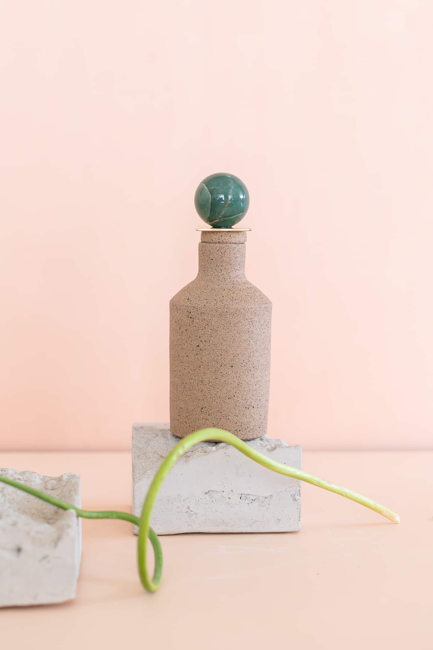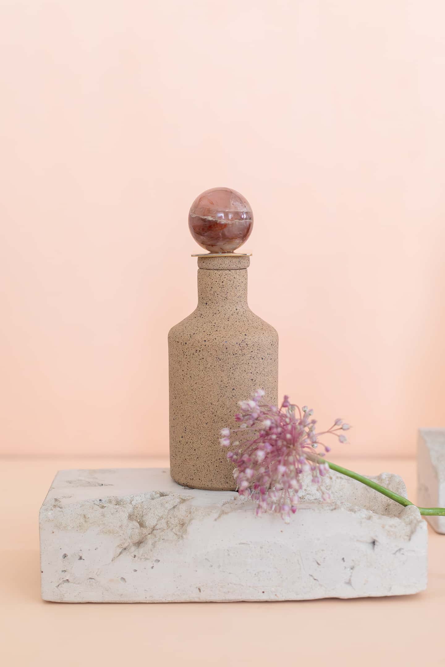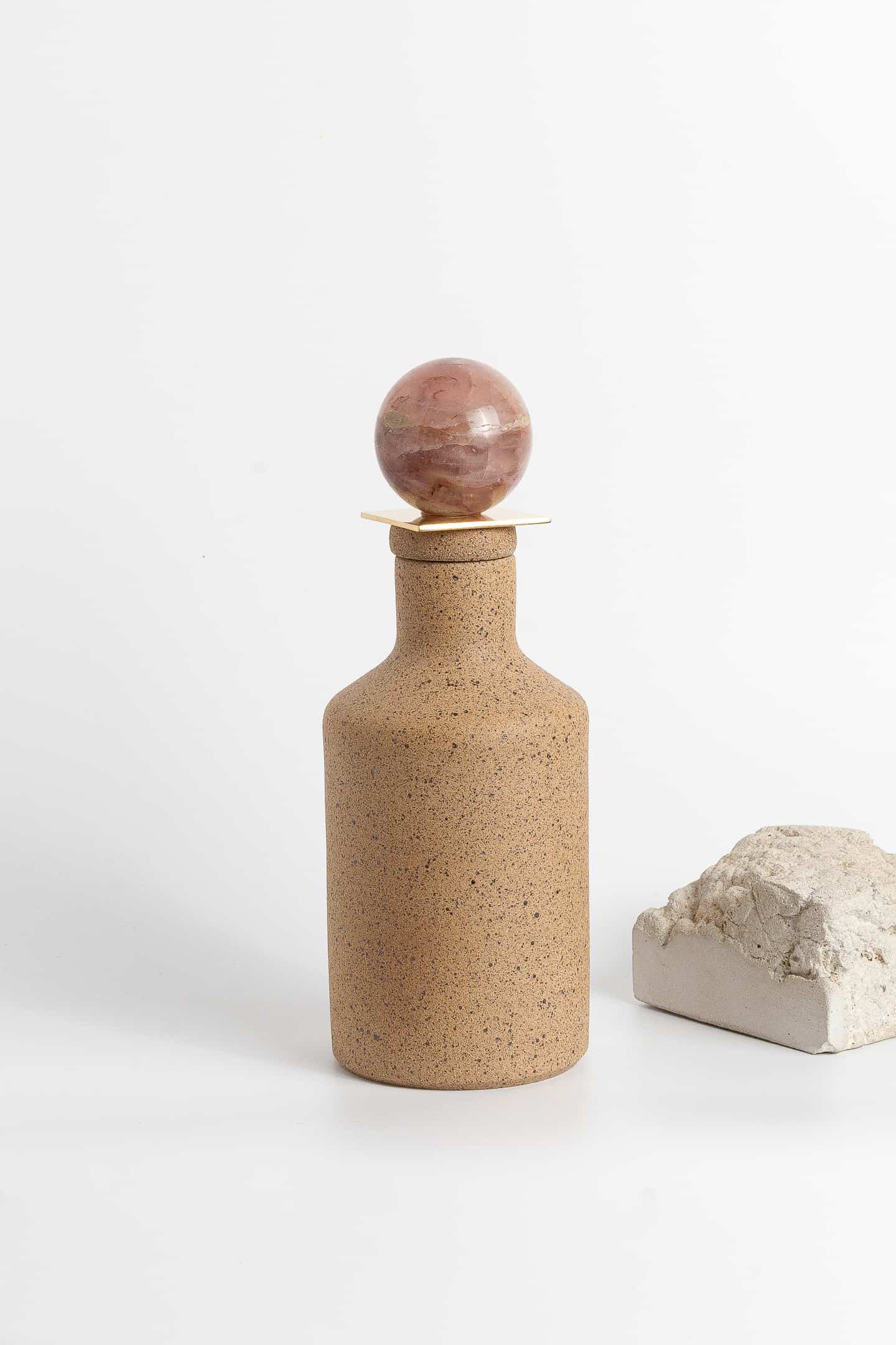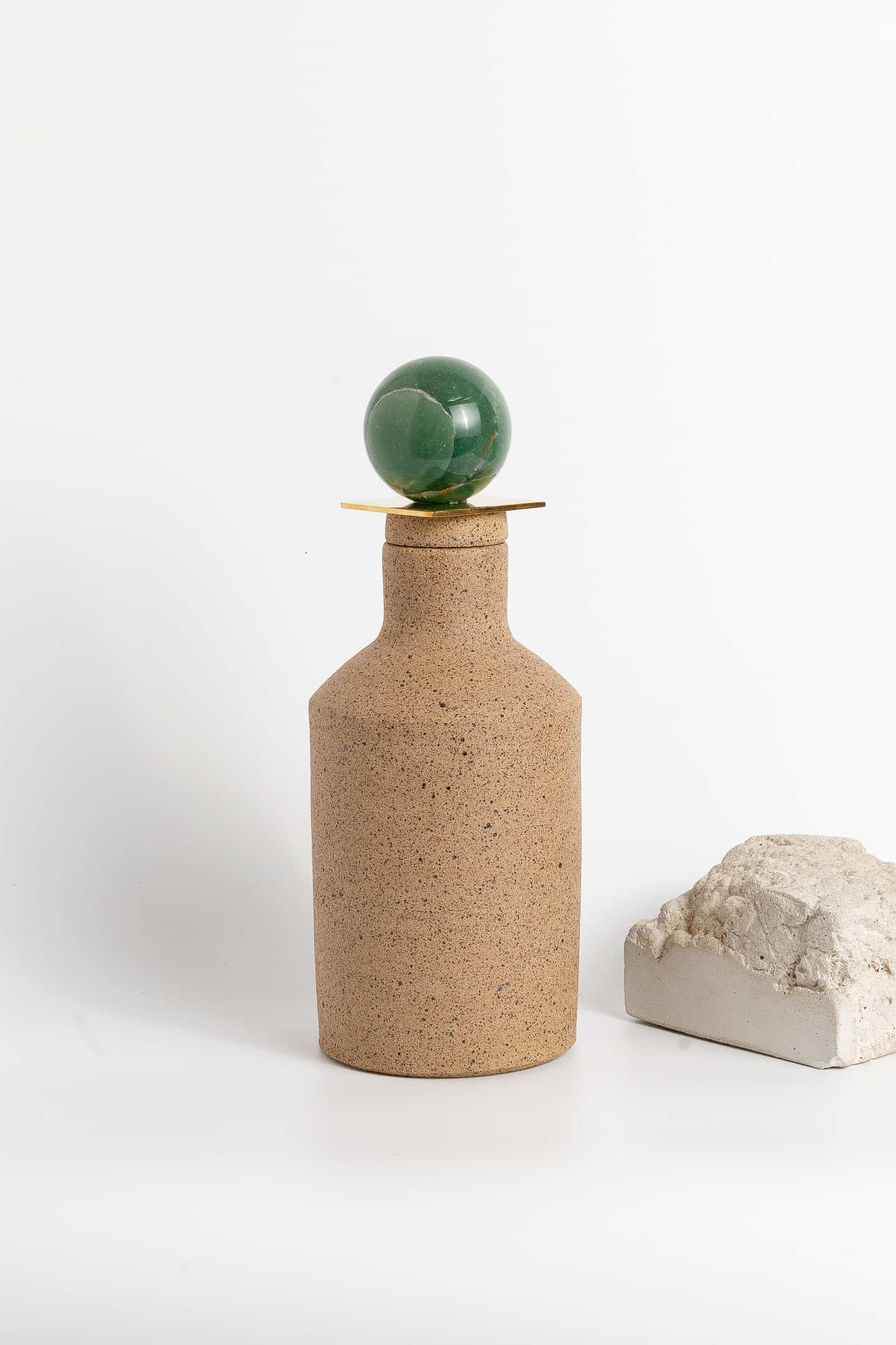 Garrafa Órbia. Uma peça que combina funcionalidade e sofisticação, esta garrafa em cerâmica se destaca pelo design minimalista e pelos detalhes que a tornam única. O corpo em cerâmica traz um acabamento natural e tátil, enquanto a tampa, composta por latão e esferas de quartzo com hematoide ou Quartzo verde. Uma peça que combina funcionalidade e sofisticação, esta garrafa em cerâmica se destaca pelo design minimalista e pelos detalhes que a tornam única. A fusão de materiais transforma esta garrafa em um objeto de destaque, perfeito para compor mesas e ambientes com autenticidade e presença.