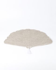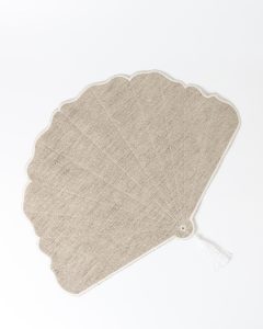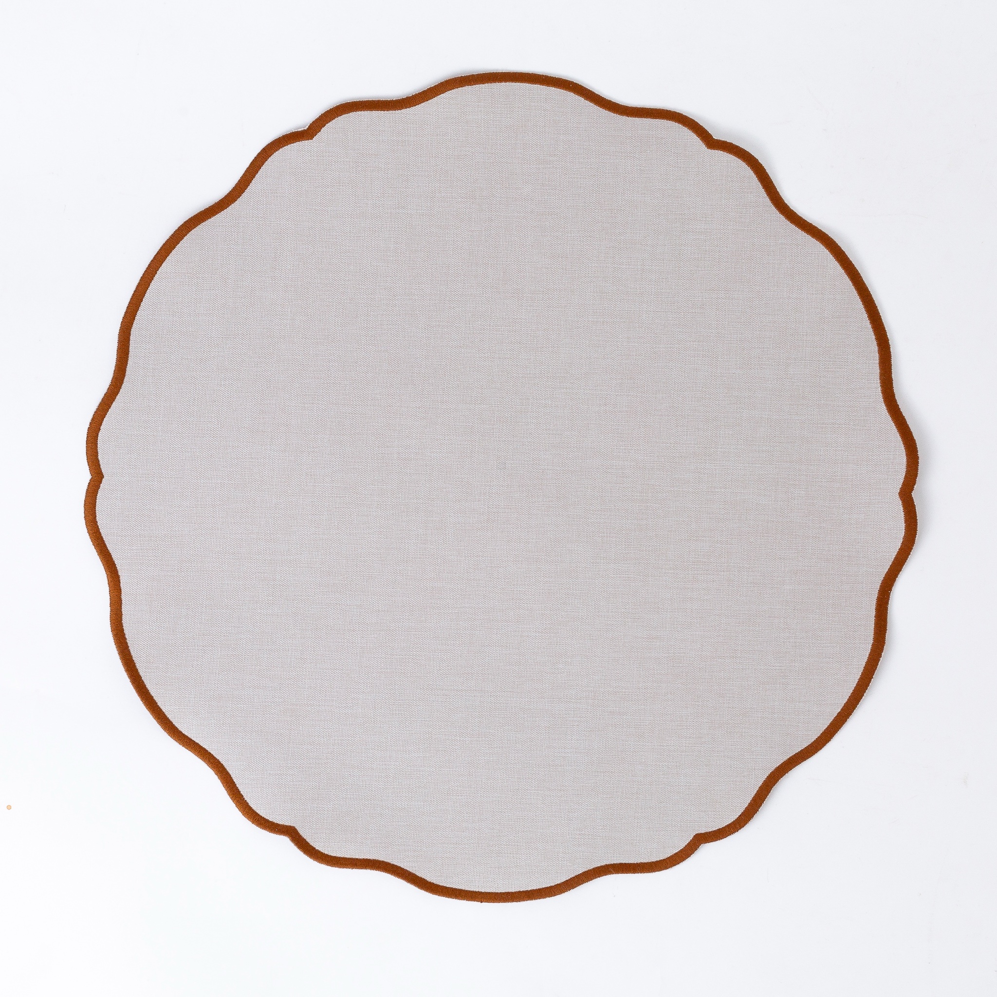 Jogo americano redondo impermeável, de tecido sintético com textura de linho, no tom caqui e acabamento em toda sua volta na cor whisk, feito à mão. Ideal para incrementar sua mesa.