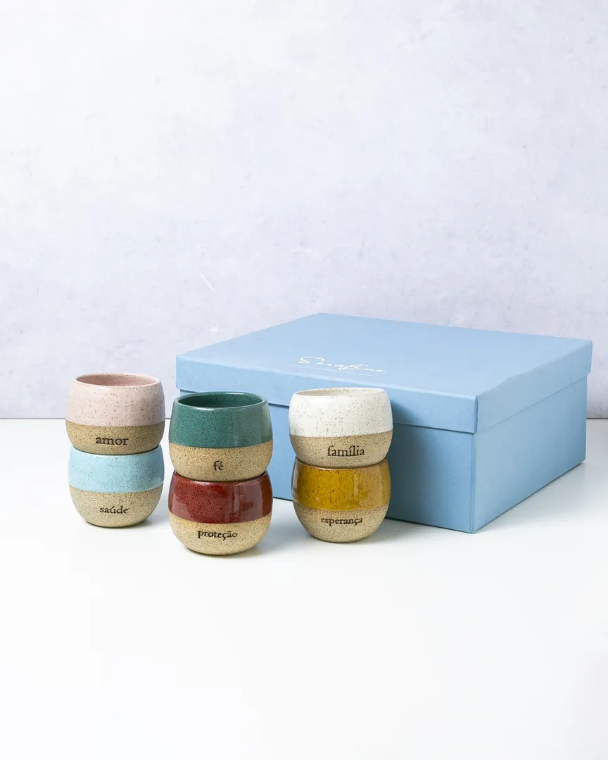 Jogo composto por 6 copos de café Faro nas cores rosa claro, azul claro, turmalina, bordô, off white e mostarda. Cada peça traz palavras escolhidas para inspirar momentos de pausa e aconchego. As peças acompanham a caixa de presente.