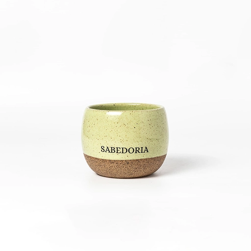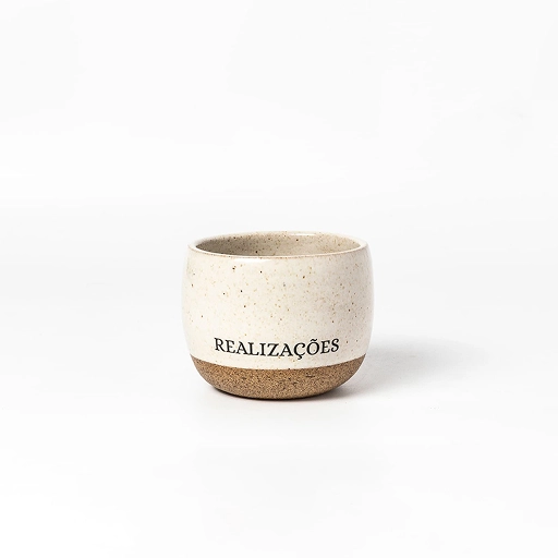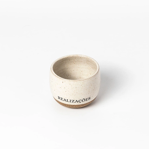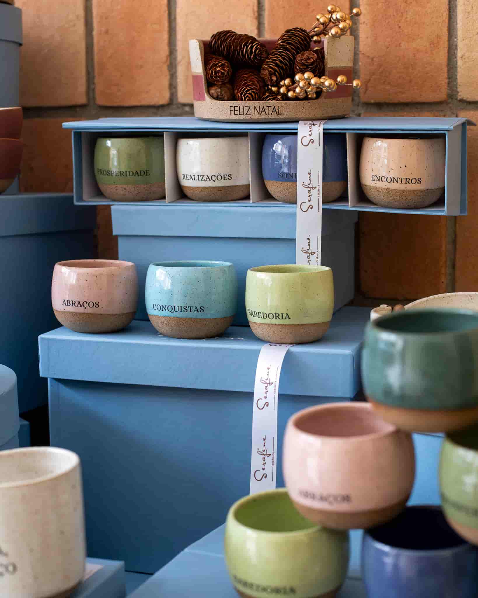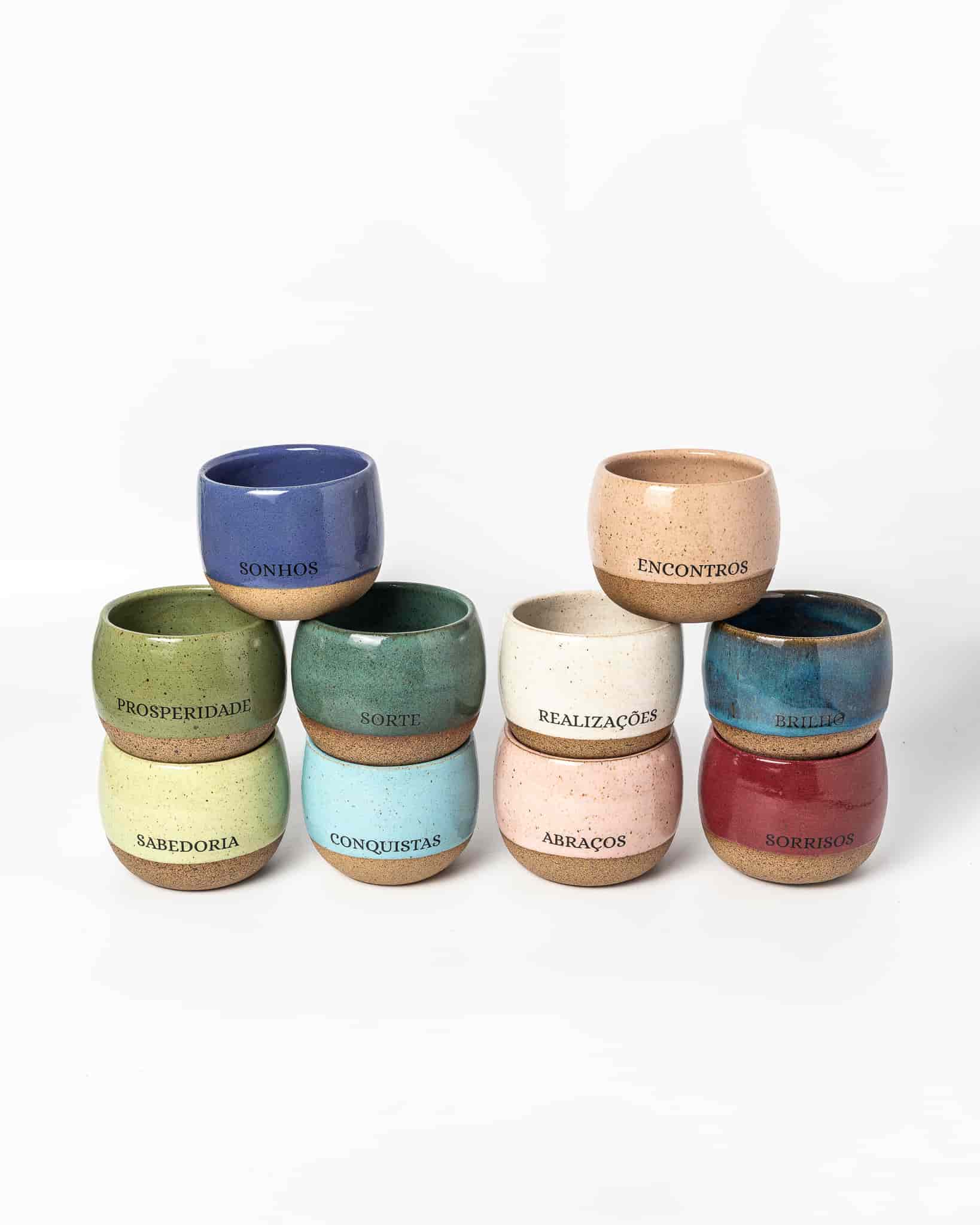 Copos em cerâmica com palavras que desejam, acolhem e acompanham.