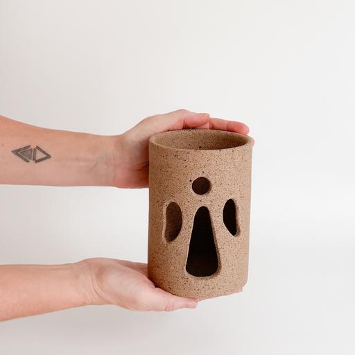 Porta vela anjo: na argila aparente com recorte delicado em formato de anjo, todo feito à mão. Remete à espiritualidade e à proteção.