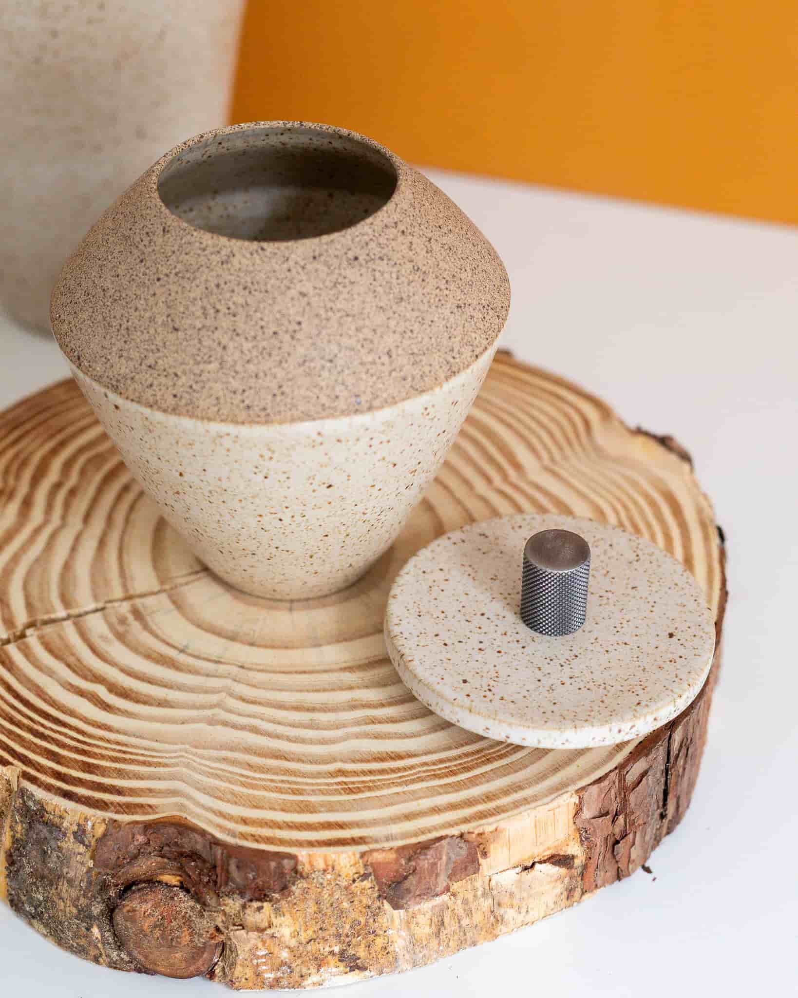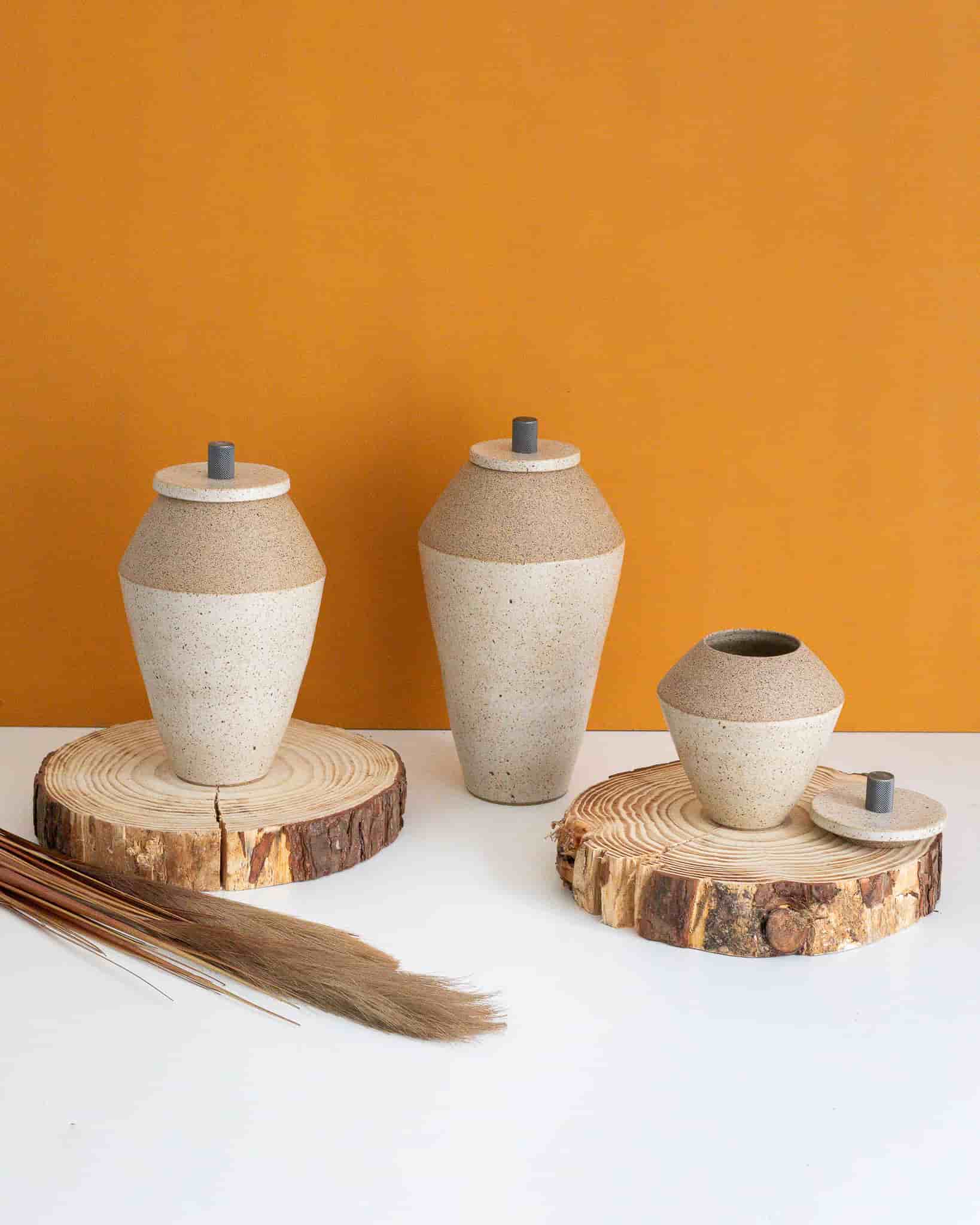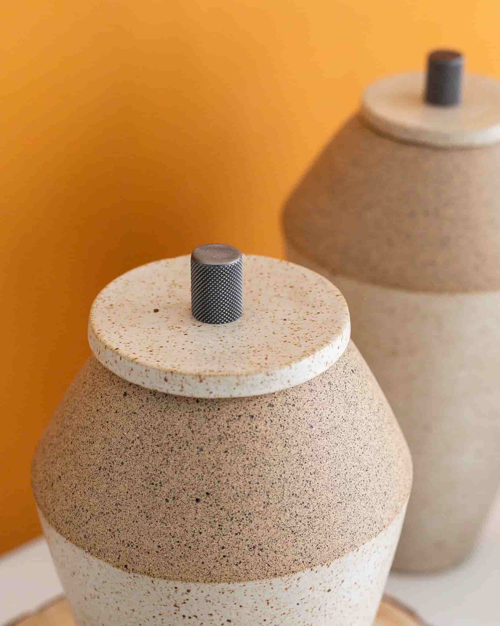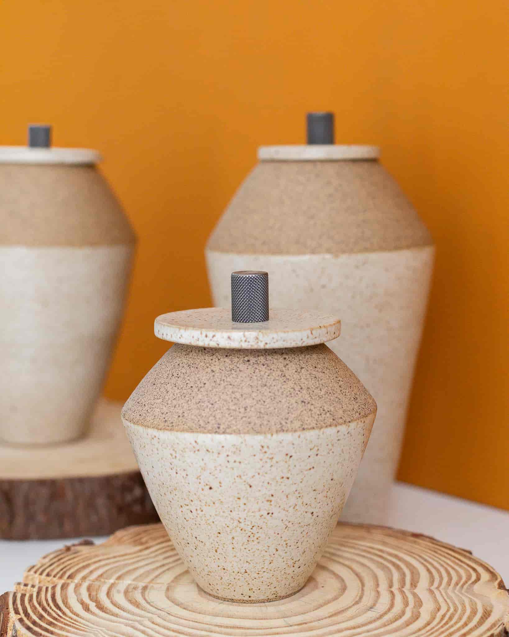 Potes Trama. Essa coleção une a cerâmica artesanal ao detalhe sofisticado do puxador em metal. Em 3 tamanhos diferentes, se destacam pela estética e forma. Traduzem o encontro dos ângulos, a precisão das linhas e o equilibrio estético, entrelaçando matéria e forma.