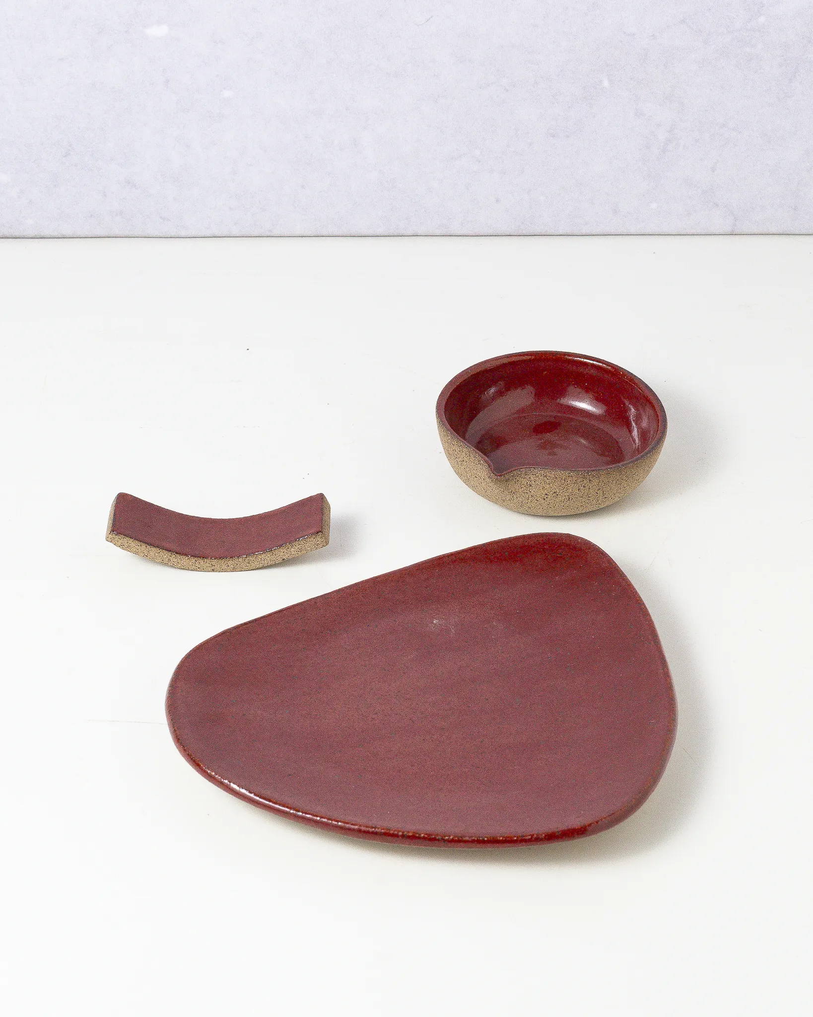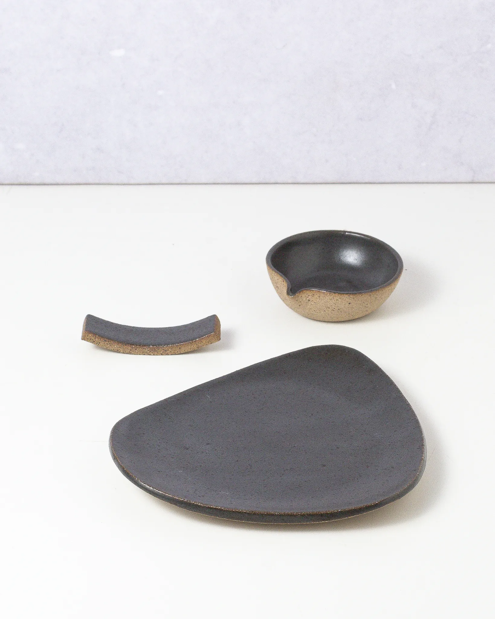 Kit composto por 3 peças da linha Koi: prato orgânico individual, shoyusara e descanso de rashi.