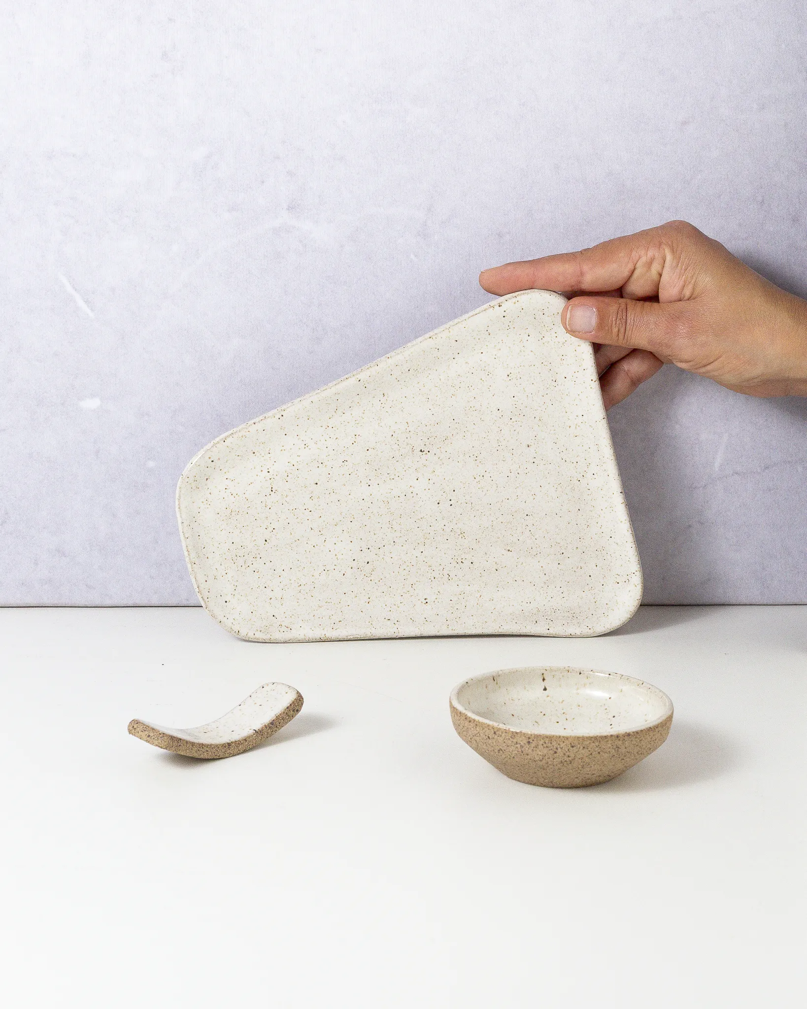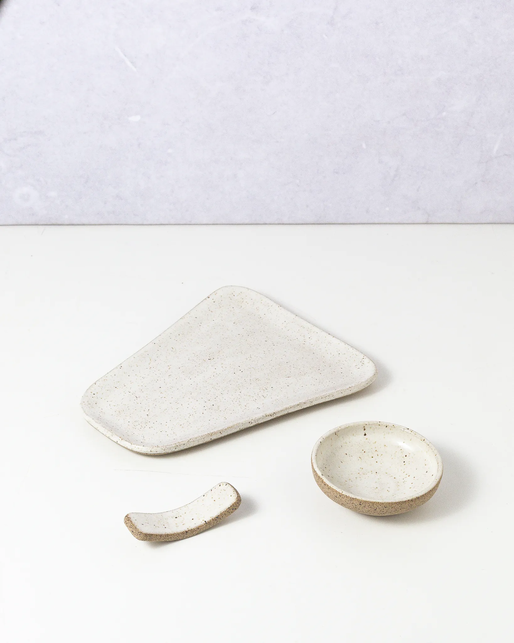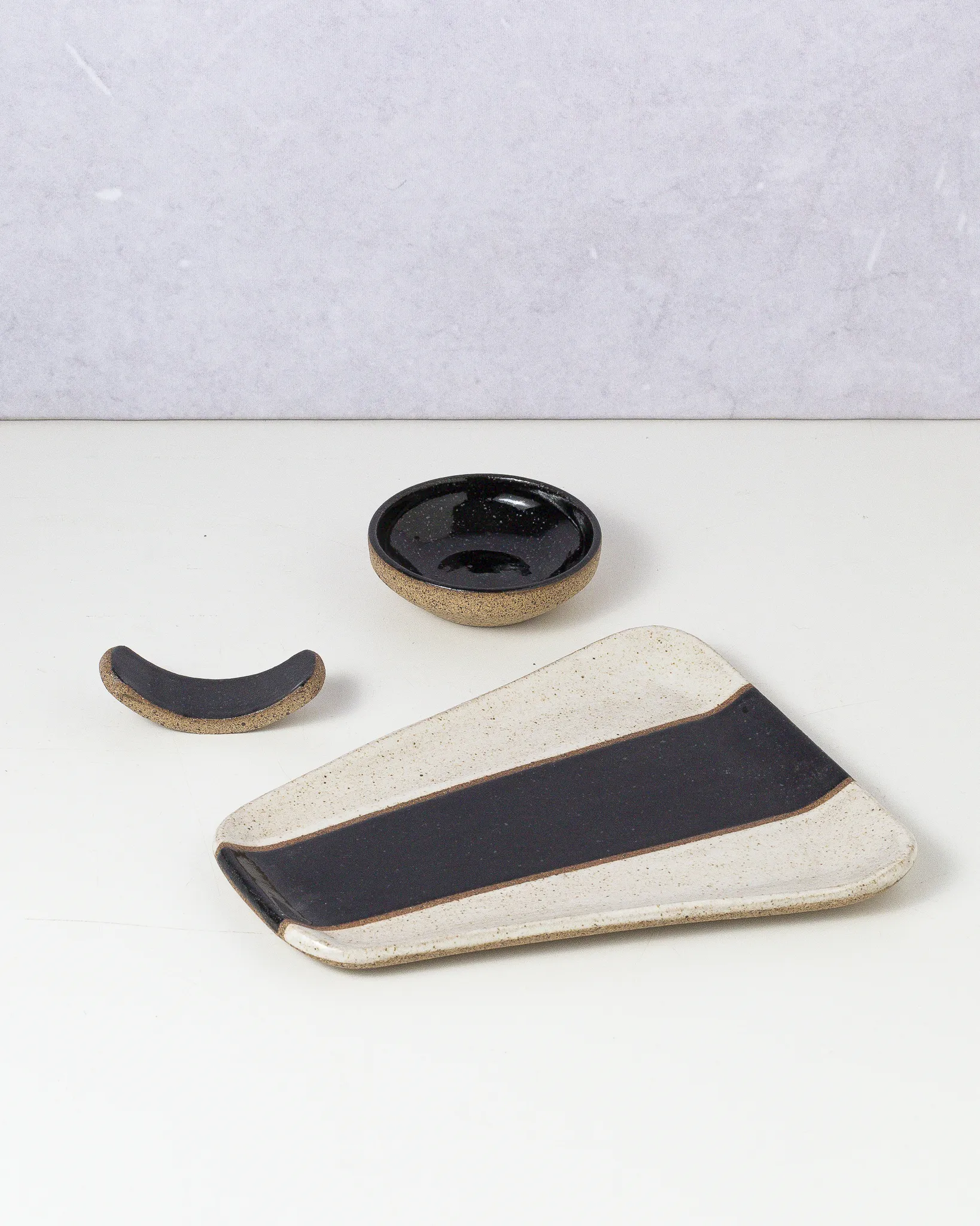 Kit composto por 3 peças da linha Serafine: prato retangular individual, shoyusara e descanso de rashi.