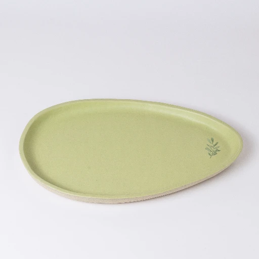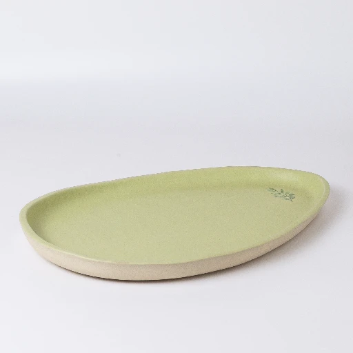 Entre Oliveiras, floresce a Páscoa. A travessa Oliveira foi desenvolvida para a Páscoa desse ano de 2025 em formato orgânico que remete ao ovo — símbolo maior da Páscoa. No canto, o ramo de Oliveira desenhado em decalque sela o desejo de paz e renovação à mesa. O verde primavera completa a narrativa: delicado, fresco, cheio de vida.