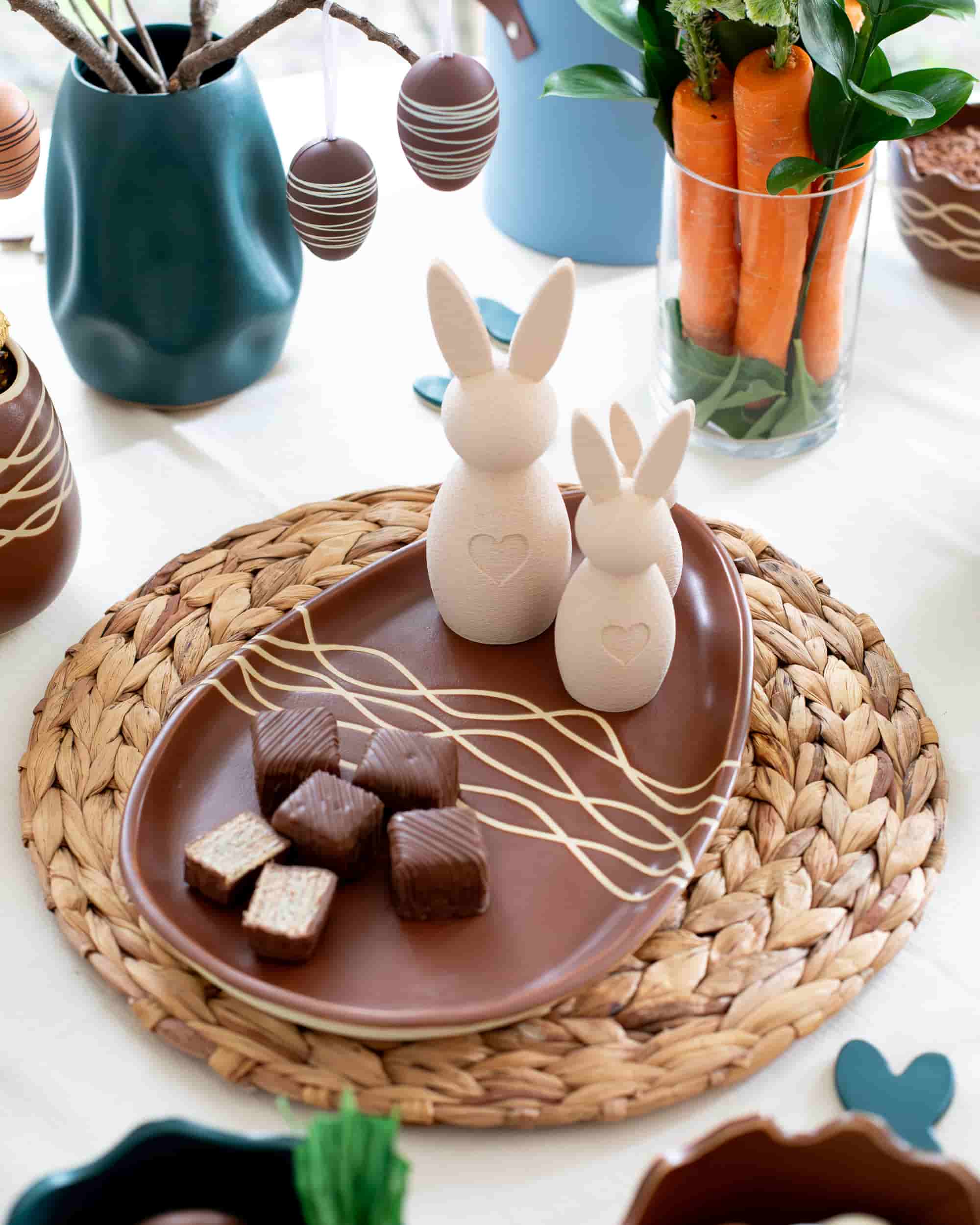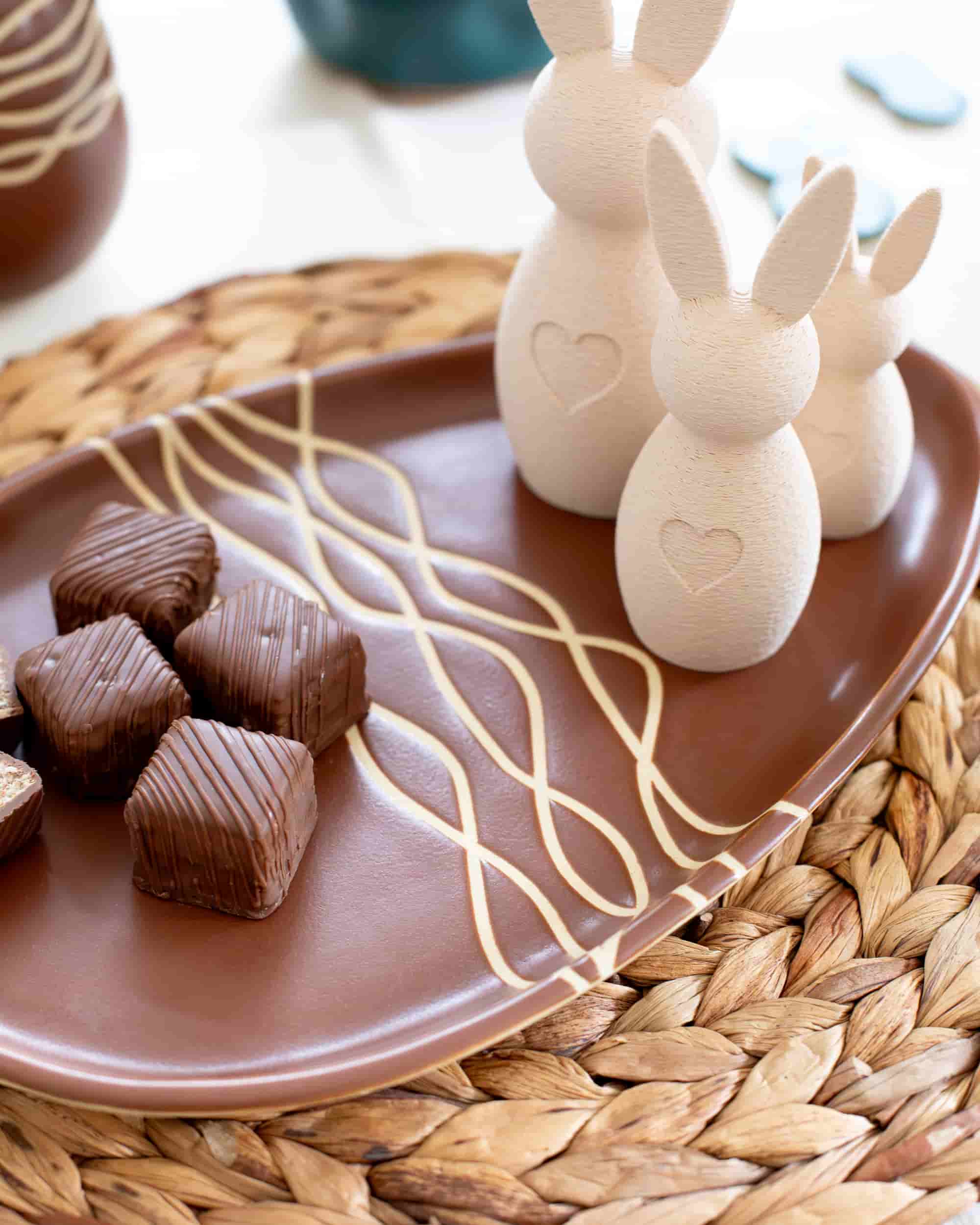 A travessa traço natural foi desenvolvida para a Páscoa desse ano de 2026 em formato orgânico que remete ao ovo — símbolo maior da Páscoa. Em 2 cores (chocolate e verde mata) e com desenhos orgânicos que tornam cada peça única.