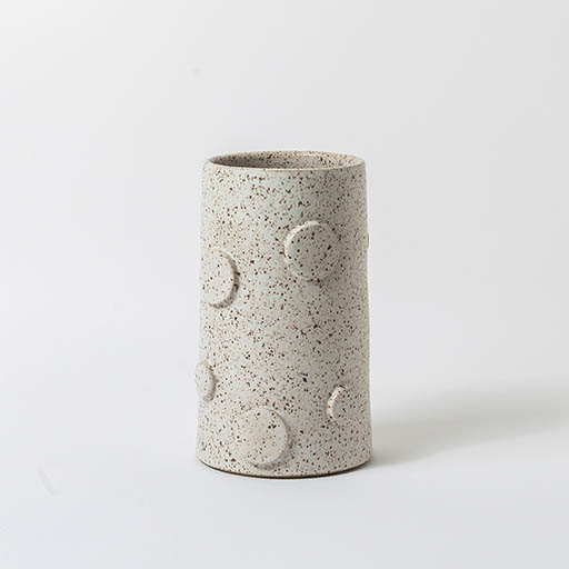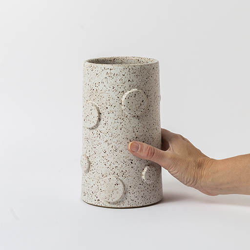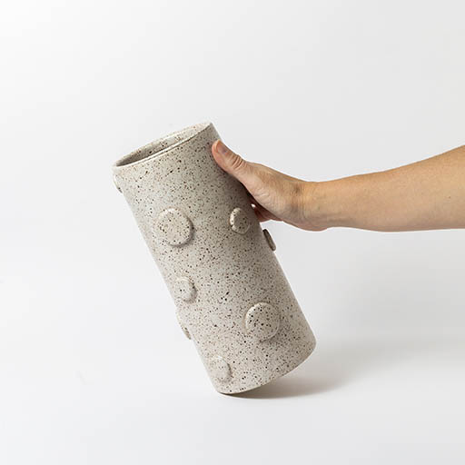 Vaso Lou, para uso decorativo e para todos os tipos de arranjos. Em formato cilindrico, com aplicações de circulos de argila em varios formatos, resultando em um conceito contemporâneo. Em dois tamanhos diferentes, são vendidos separadamente.