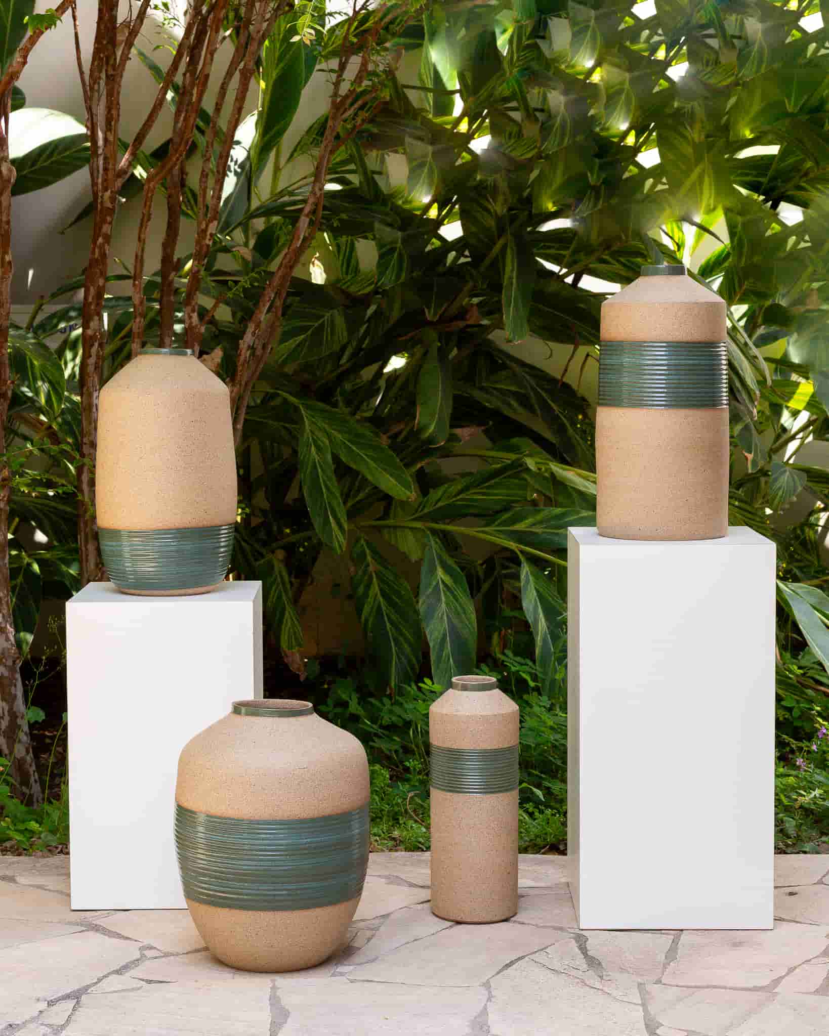 Com volumes bem definidos e uma textura marcada que atravessa o corpo da peça, cada vaso carrega presença mesmo quando usado sozinho. As proporções variam entre os tamanhos, mas mantêm a mesma identidade: cerâmica artesanal, acabamento cuidadoso e uma leitura elegante do barro. São vasos pensados para existir apenas como objeto, juntos ou separados, ocupando o espaço com naturalidade e discrição.